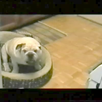 Man holds a bull dog and a woman shows it the vacuum. Dog makes a funny screaming sound & goes crazy.