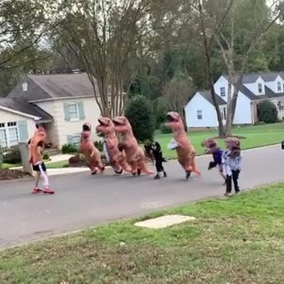 Children wear inflatable dinosaur costumes and race young boys down a street. Several of the children trip and fall down.