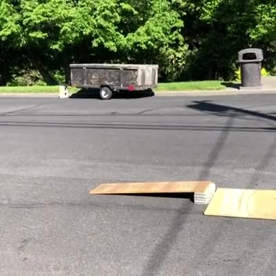 A man outside pulls on a cord to start his minibike. Once he gets it started, it goes without him on it and crashes into the street. Security Footage.