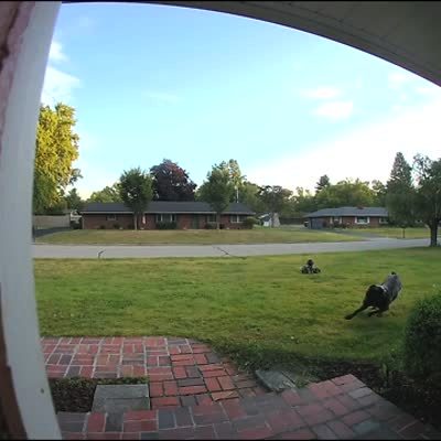 A man takes his 120 pound dog out on its leash, when he darts around in a yard and takes out a large street lamp and drags it throughout the yard. Security footage. Social media video.