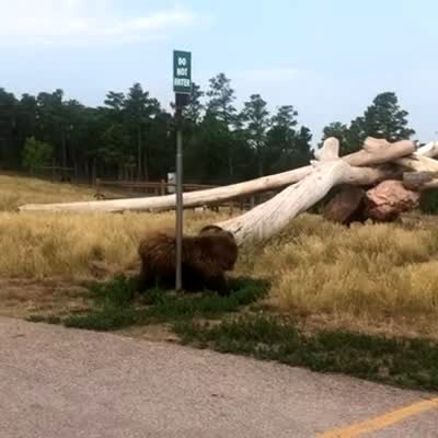 A bear walks up to a pole outside, then itches his back and butt while a man, woman, and kids laugh.