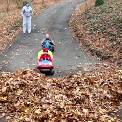 Two teen girls outside get into a wagon and roll down a hill. One of them jumps out but the other runs into an incline and the whole wagon falls over.