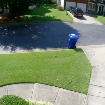 A car rolls down the driveway in reverse and crosses the street and a man runs out of the garage and trips and falls. Security footage.