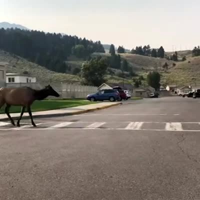 Two moose walk across a crosswalk outside, and a woman says that they are polite.