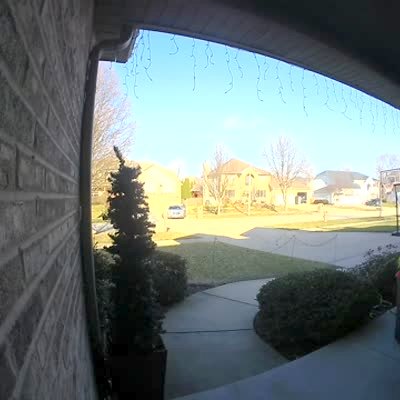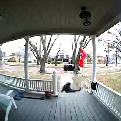 A man exits a front porch and slips and falls backwards then proceeds to cautiously waddle back down a sidewalk. Security footage.