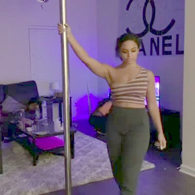 A woman dances and spins on a stripper pole. The pole falls over and she lands on top of her dog. Music rights not cleared.