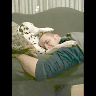 A dalmation dog lies on a couch and lets a man lie with him. The dog stroke the top of the man's head lovingly. Cute.