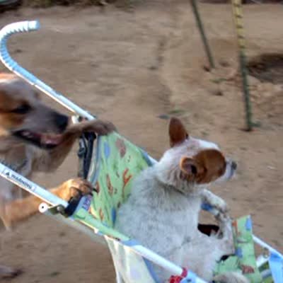 A small dog sits in a child's car toy stroller on a road. Another small dog paws at the back of the stroller and pushes it up and down a road. Multiple cuts.