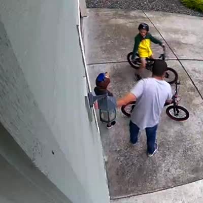 A man lets go of a baby girl's stroller and it rolls down the driveway, so he chases after it. Security footage.