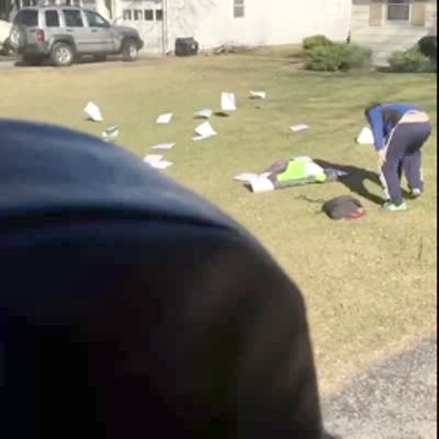 As a woman walks down her driveway, she sees a trampoline float through the air and fall onto a neighbor's roof. Security Footage.
