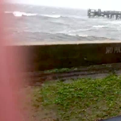 Two young boys and a young girl walk into a driveway while Hurricane Ian blows their umbrellas away. The strong winds then blows one of the tot boys to the ground and breaks his umbrella.