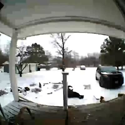 A Golden Retriever dog runs into a front yard in the winter snow and pulls on a leash and a woman falls down and flies over the front porch steps onto the ground.