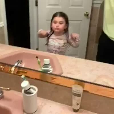 A young girl flexes her muscles in a bathroom and tells her father she's like a chicken.