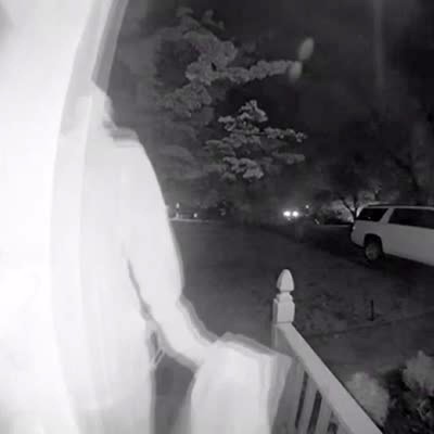 A screen door opens suddenly in a young girl's face and she falls down a porch staircase in a front yard. Security camera footage.
