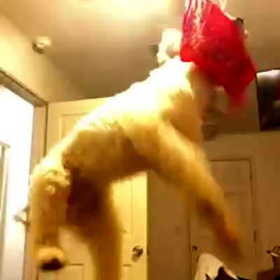 A large dog pulls on a handkerchief and turns on a light in a bedroom.