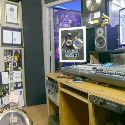 A man in a recording studio is about to play the banjo and falls in his chair.
