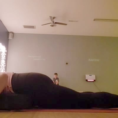 A woman does a handstand with her chest on a small box at a yoga studio, then screams and falls on her face.