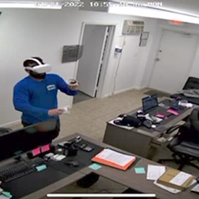 A man punches his arms into the air as he plays a virtual reality game in a living room. Then he punches his computer monitor and breaks it. Security footage.
