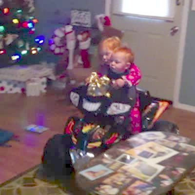 A tot girl is riding on a four wheeler inside while holding on to her baby brother. She drives into a table and knocks stuff over and says "I didn't mean to."