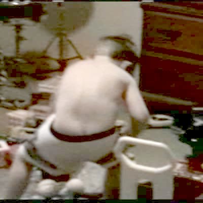Man on Segway rides through the house. The Segway slips on the carpet & man loses control, hitting a potted plant.