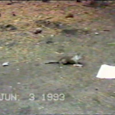 "Squirrel Paper Saver" Squirrel stuffs paper into mouth then goes down hole.