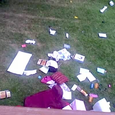 Tot boy walks out onto the porch, man asks if he's been throwing stuff off the porch. Camera pans to reveal tons of toys on the ground. In trouble, mess.