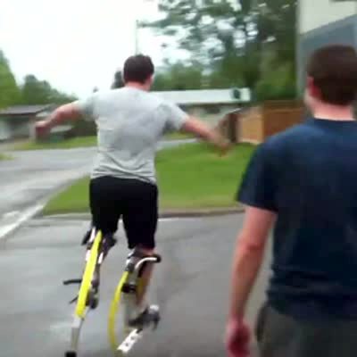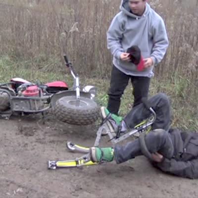 On a dirt path next to a field, a man jumps up and down on running/jumping stilts. Another man rides a dirt bike motorcycle down the path. The man on the stilts tries to jump over the motorcycle, but the motorcycle crashes into him and knocks him down to the ground. Later, the man successfully jumps over the motorcycle. Multiple cuts. Slow motion replays after each jump. Short tails on second jump.