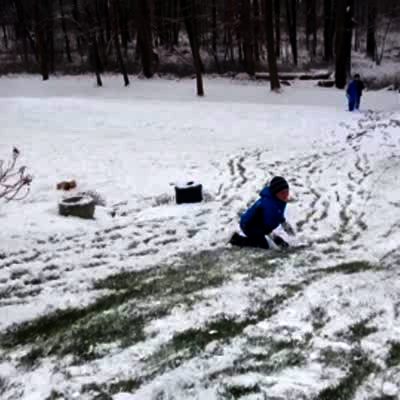 A boy runs and tries jumping on his sled but misses landing in front of it in the snow tumbling. The third try is successful.