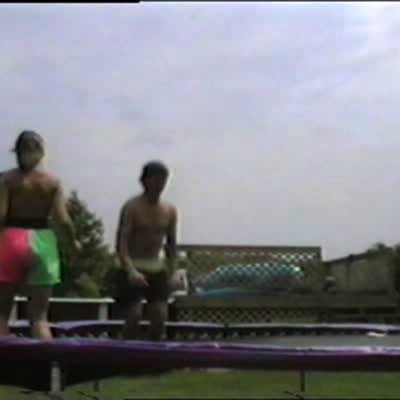Trampoline guy does a successful flip... then loses his balance and falls off outdoors, backyard