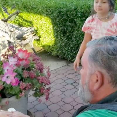 A man smacks a dollop of whipped cream on the back of his hand into his daughter's mouth in a yard.