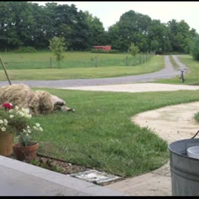 A young boy hides in a ghillie suit and scares a woman and another young boy that walk up to the house.