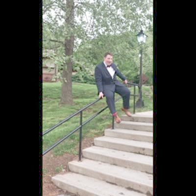 A teen boy in a suit falls in the grass at a school after he loses his balance while he slides down a handrail.
