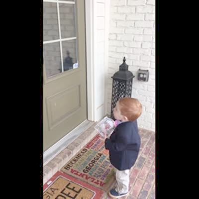 A tot boy in a suit walks up to a front door with a corsage. A tot girl opens the door and the tot boy drops the corsage on the floor and walks away.