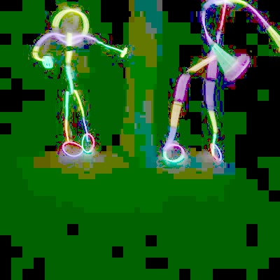 Two people dance in glow stick costumes in a dark living room. Around 0:35 one of them loses the glow stick on their head and it falls down. The woman with the camera laughs.