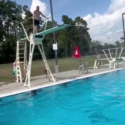 A man slips on a diving board and bounces into the water. Featured talent cleared only (the man who slips on the diving board).