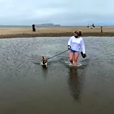 A man and woman try to do the Dirty Dancing lift on the beach, but the man drops her and she falls hard on the wet sand.