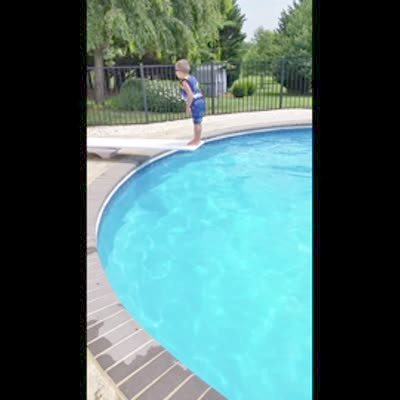 A tot boy tries to jump into a kiddie pool, but slips and falls in. He quickly gets up and says "nope".