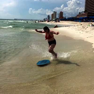 A woman falls off a skimboard when she jumps on it as a wave hits the beach.