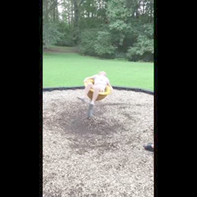 A teen boy hits his groin on a scooter when he lands on its handlebars after he does a backflip off of a zipline at a playground park.