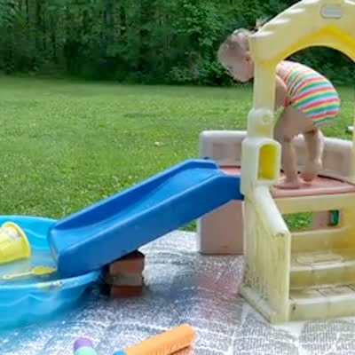 A tot girl jumps down a small slide into a kids pool and lands face down in the water.
