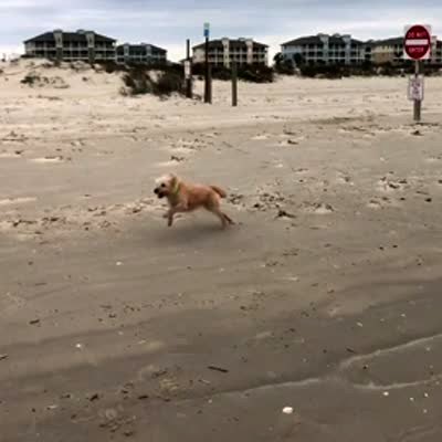 A dog on a beach does a back flip in order to catch sand out of the air.