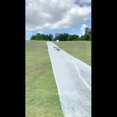 A dad slides down a backyard slip and slide quickly and stands up but falls backwards onto the ground and a woman laughs.