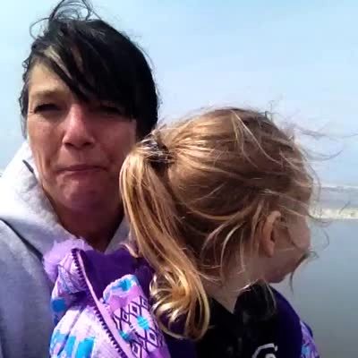 A woman records herself and her tot girl at the beach. They say hi to the camera, then a wave crashes and hits them and the girl screams.