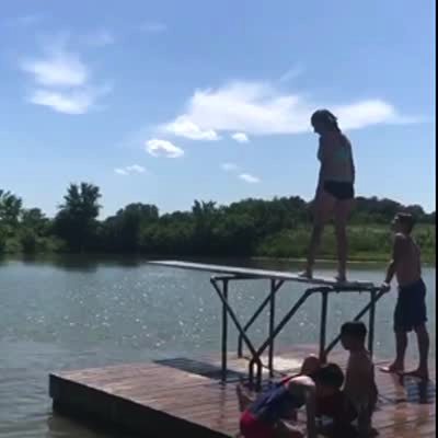 A teen girl attempts to dive off a board. She slips at the edge and falls in the water.