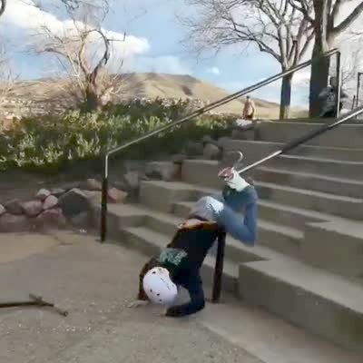 A young boy tries to do a scooter trick at a park. He jumps onto a railing with the scooter then falls onto it and gets hit in the crotch.