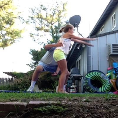 A teen girl records herself to show how to do a Color Guard trick, but she steps back too far and falls out of frame into the swimming pool.