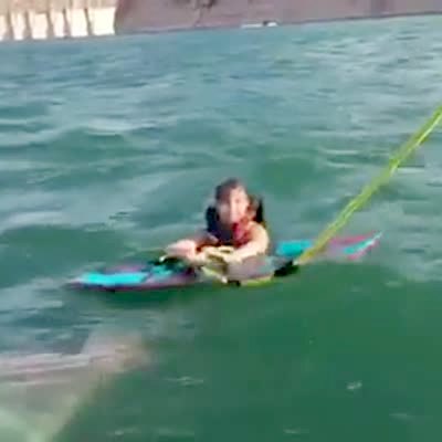 A man grabs on to a young boy's leg in a lake and the boy screams in fright.