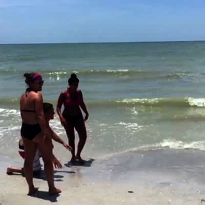 A man jumps on large air pad to launch a woman in the air and she lands hard on the beach sand.