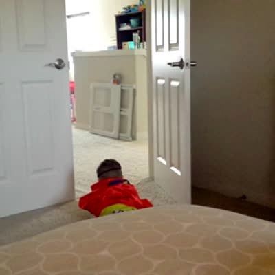 A young boy trips and falls down when he runs out of a room in a superhero costume.