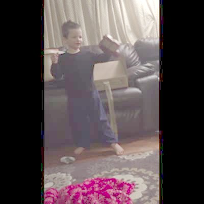 A young boy says that he's a superhero and holds up a toy gun and calls it a "pewer." He starts to shoot it and makes a "pew" sound effect with his mouth.